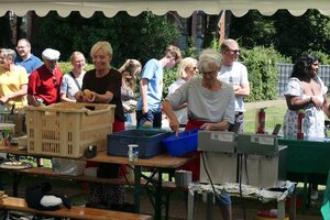 Nach dem Gottesdienst fand die Prozession mit dem feierlichen Abschlusssegen in der Kirche statt. Anschließend wurden die durstigen Gottesdienstbesucher zum Empfang auf der Pfarrwiese eingeladen.