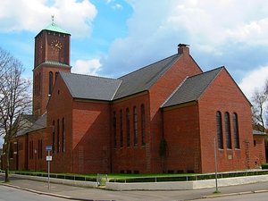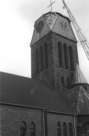 Die Kirche mit dem weithin sichtbaren Kirchturm, jetzt schon mit Turmuhr. Rechts im Hintergrund die Fördertürme der Zeche Victor I/II.