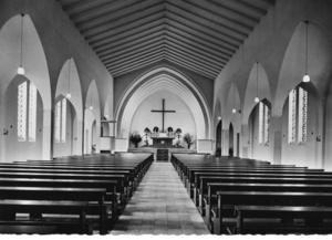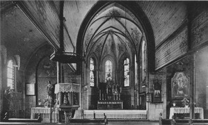 Innenaufnahme der Herz-Jesu-Kirche vor dem 2. Weltkrieg. Links hinter der Kanzel der Seitenaltar mit einer Herz-Jesu-Figur, rechts der Seitenaltar mit einem Altarbild "Maria Himmelfahrt".