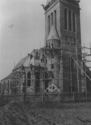 Nachträglicher Bau des Kirchturmes mit zwei Seitenkapellen im Jahr 1906.