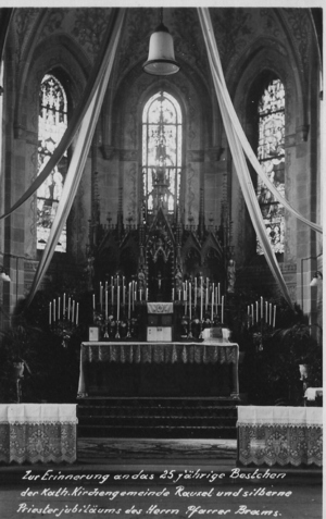 Ein Blick auf den geschmückten Hochaltar am 25.08.1928, dem Tag des Silbernen Priesterjubiläums von Pfarrer Wilhelm Brams.