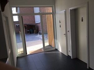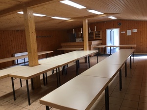 Der Saal mit Theke kann voll bestuhlt werden. Eine direkt angrenzende Küche mit ausreichend Geschirr bietet ausreichend Platz für Vorbereitungen und Abstellmöglichkeiten. Außerdem befindet sich im Eingangsbereich eine WC-Anlage und eine Garderobe.